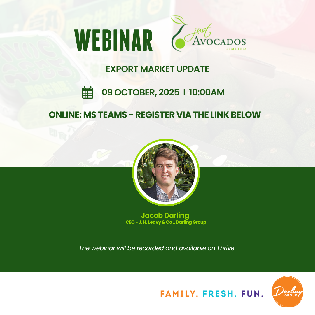 Join the Darling Group marketing team for an update on the 2024-25 avocado export season and a discussion of what's to come. Most of the time in this webinar will be allocated to covering off your questions in a Q&A session so please come with a list. If you have any topics or questions that...